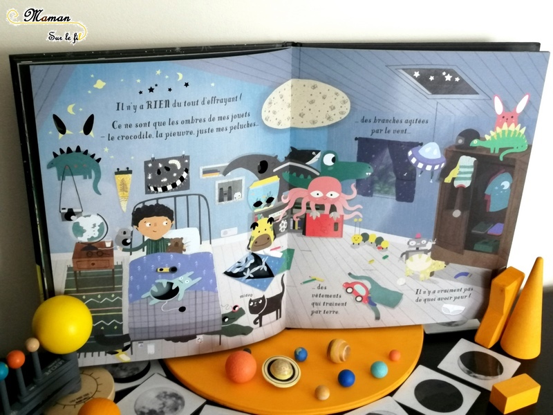 Bref, les découpes subliment les jeux de lumière des illustrations. Ces mêmes dessins permettent vraiment de dédramatiser les petits détails qui peuvent faire peur dans le noir.