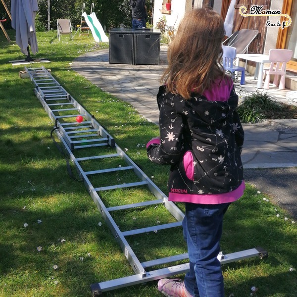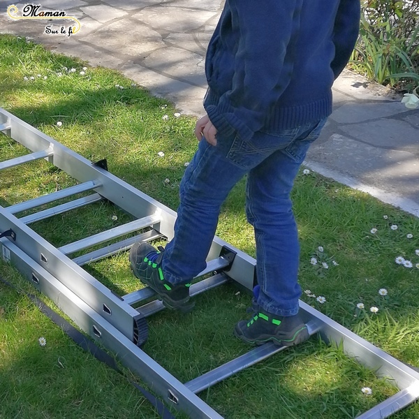 Nous avons la chance d’avoir un jardin et les enfants commencent à avoir un grand besoin d’activités physiques. Nous leur avons donc proposé des jeux de motricité avec une échelle.
