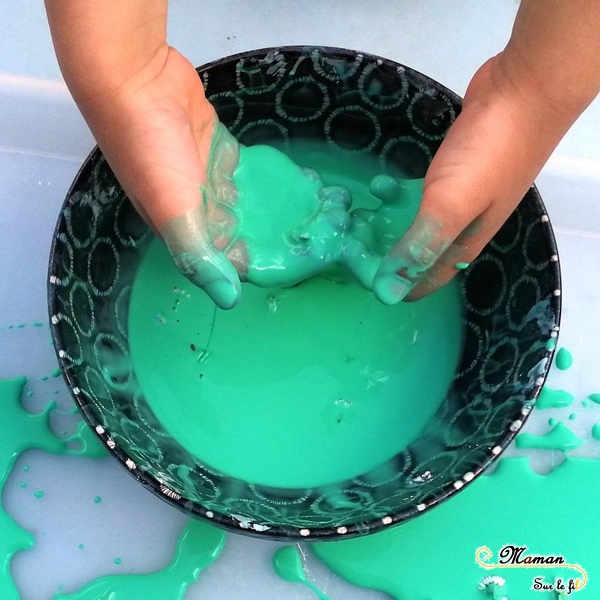 Cette semaine, nous avons découvert une nouvelle expérience étonnante : la pâte à patouille. Je l’ai déclinée sous une forme printanière. Cette matière à la particularité d’être solide quand on appuie dessus mais de redevenir liquide sans sollicitation.