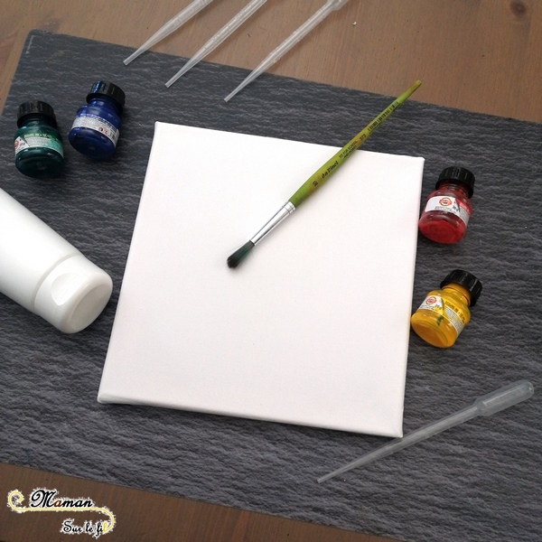 Dans un premier temps, nous avons étalé une couche épaisse de peinture blanche sur une toile carrée.