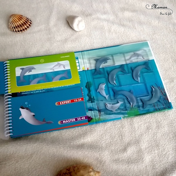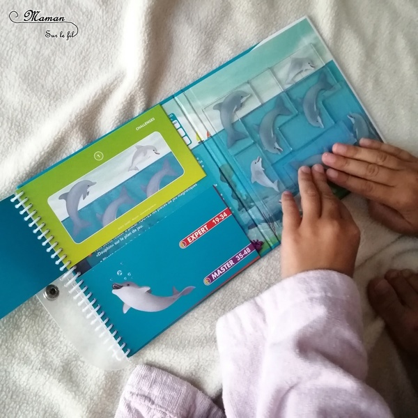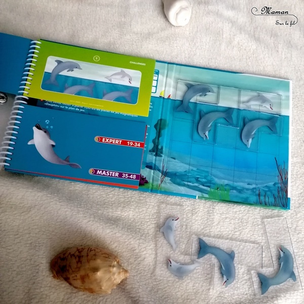 Dans Dauphins Joueurs, il faut placer tous les pièces Dauphins. Pour chaque défi, nous ne voyons que ce qui se trouve au-dessus de la mer (et juste en-dessous pour les premiers niveaux). Il est conseillé à partir de 7 ans, il est effectivement un peu plus difficile.