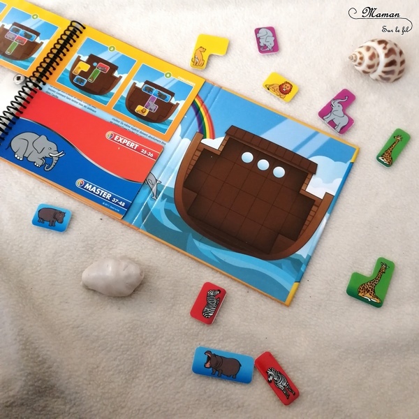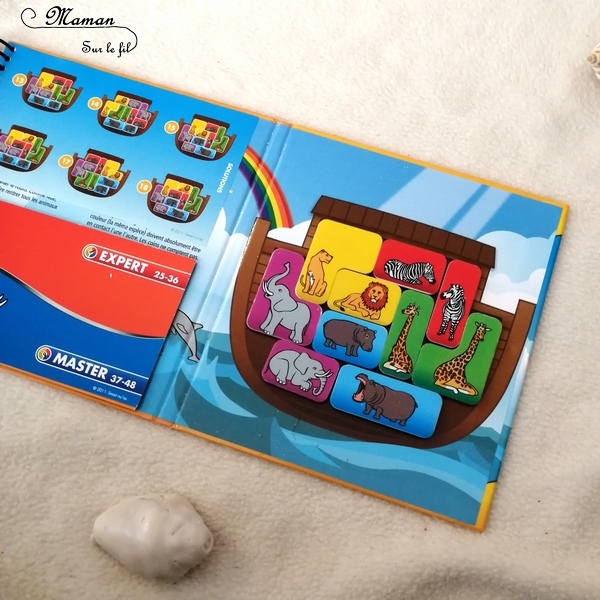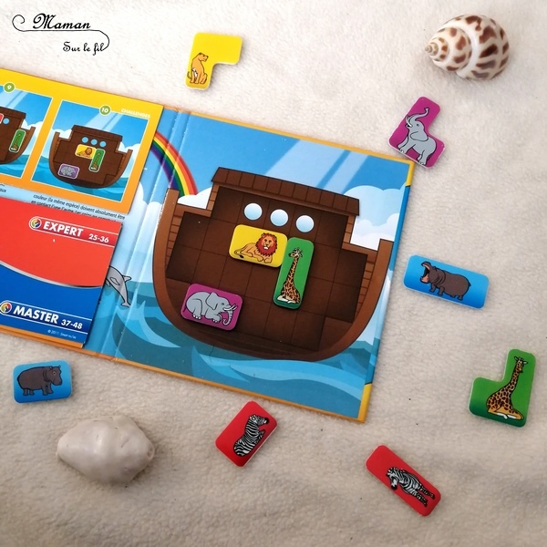 L’Arche de Noé, conseillé à partir de 5 ans, est un peu plus simple. Dans celui-ci, il faut placer les animaux dans l’Arche de Noé en ne séparant pas les espèces. Selon le niveau du défi, l’emplacement de plus ou moins de pièces est indiqué. Au joueur de compléter le reste de l’arche.
