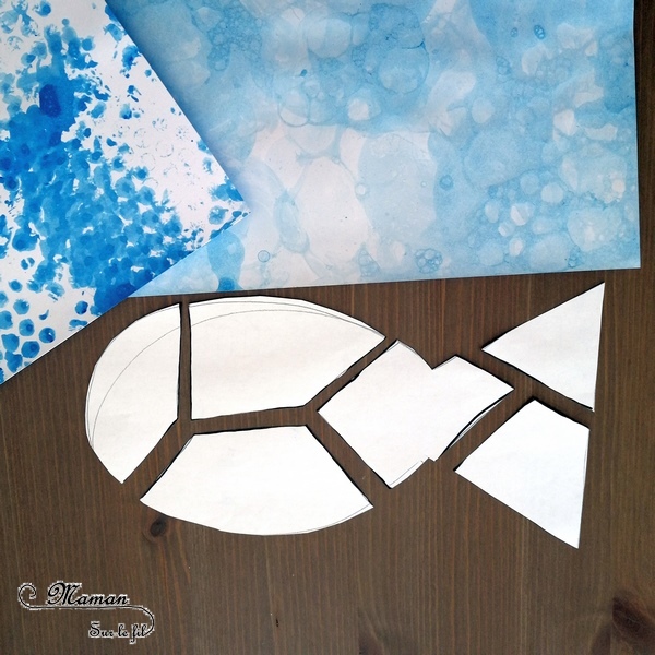 Ensuite, j’ai découpé dans une feuille blanche un gabarit de poisson. Puis, je l’ai re-découpé en plusieurs pièces de puzzle.