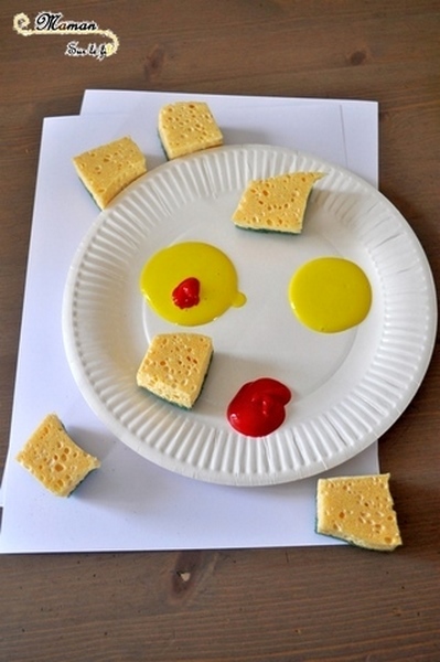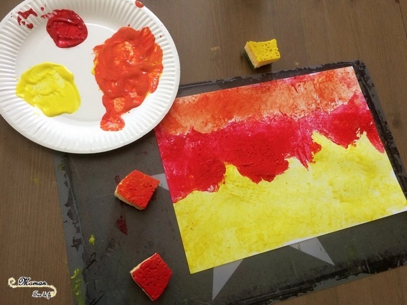 Le deuxième fond a été réalisé avec de la peinture appliquée avec des tampons découpés dans des éponges. Une nouvelle fois, j’ai mis à disposition les couleurs jaune, orange et rouge.