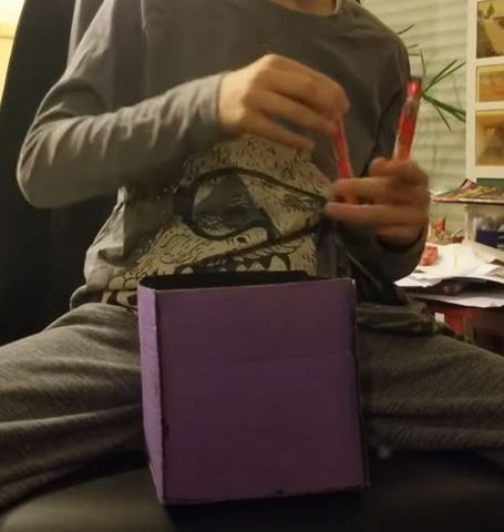 Nous n’aimons pas rester sur un échec alors nous avons testé une autre technique. Nous avons noué un Lego à un bout de laine que nous avons passé dans le crépon à l’aide d’une aiguille en plastique. Au moment de coller le crépon en bas du rouleau, le Lego doit se trouver à l’intérieur du rouleau.