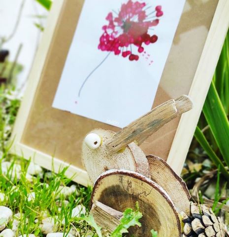Un tableau fleuri, un pissenlit et un lapin en rondins chez MuliDIY sur Instagram