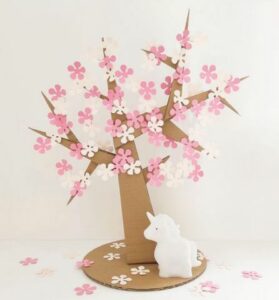 Enfin, nous avons collé les fleurs sur la branche afin d’obtenir le rendu d’un cerisier japonais en origami. Pour bien les fixer, nous avons mis de la colle sur le pic du dessous de la fleur et sur l’un des pétales.