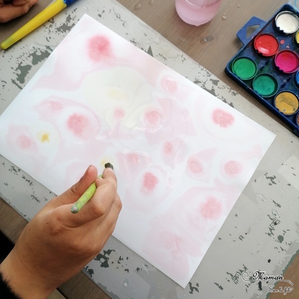 Ensuite, Chipette a voulu réutilisé la technique type aquarelle que nous avions utilisée pour nos champs de fleurs. Il faut bien humidifier une feuille blanche cartonnée avec de l’eau et un pinceau. Ensuite, il faut poser des tâches de couleur avec de la gouache en pastilles. Nous avons continué à jouer sur les couleurs jaune, orange et rouge.