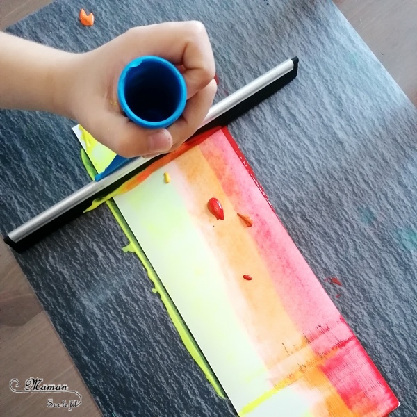 BidouBoy a posé des gouttes de peinture sur une extrémité de manière dégradée du rouge vers le jaune. Il a ensuite passé la raclette pour étaler la peinture. Dans un sens, puis dans l’autre, puis de haut en bas… Il a fini par faire des mouvements irréguliers.