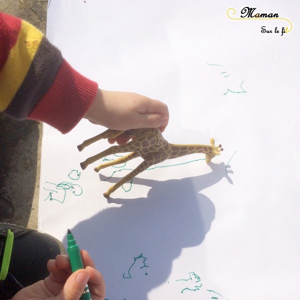 Je profite du thème du RV Sur Le Fil sur le soleil pour vous montrer une activité que nous avons faite il y a quelques années : dessiner avec les ombres. Nous avions, entre autres, utilisé des figurines d’animaux de la savane Playmobil. Du coup, ça colle aussi à notre thème du moment sur le Kenya.