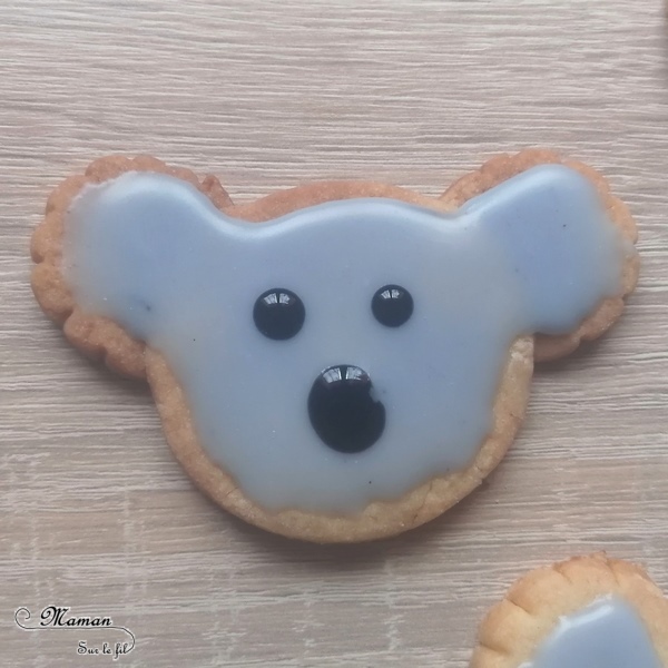 Voilà le rendu de nos sablés Koalas, aux visages tout tordus ! Je vous conseille davantage de patience pour un résultat plus précis. Laissez sécher correctement chaque couche de glaçage.