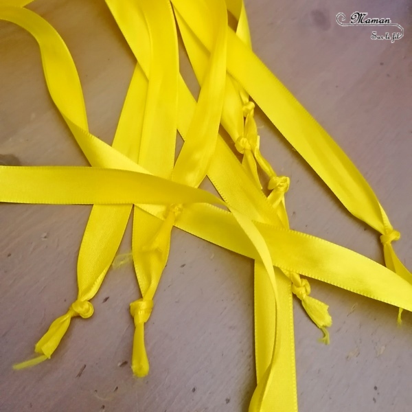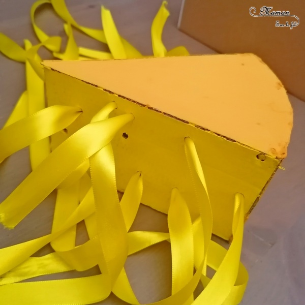 Après séchage, nous avons passé des rubans jaunes dans les trous. J’ai utilisé des chutes récupérées d’un ancien bricolage de ma fille. Les rubans étaient donc de tailles différentes. Chaque ruban traverse le fromage, chaque ruban passe donc dans un trou d’un côté et dans un trou de l’autre. Nous avons fait attention à bien entremêler les rubans.
