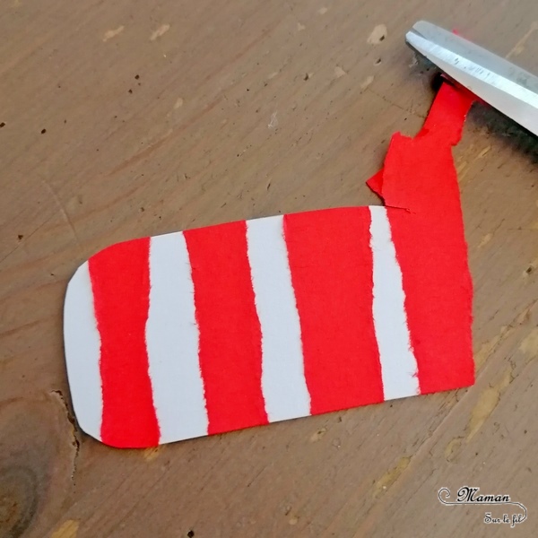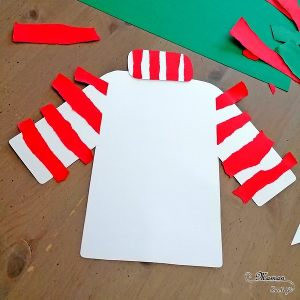 Nous avons ensuite déchiré des bandes de papier vert et rouge. Ma grande a choisi de faire un pull rouge et blanc. Elle n’a donc utilisé que des bandes rouges qu’elle a placées puis collées sur le col, les manches et enfin le corps du pull.