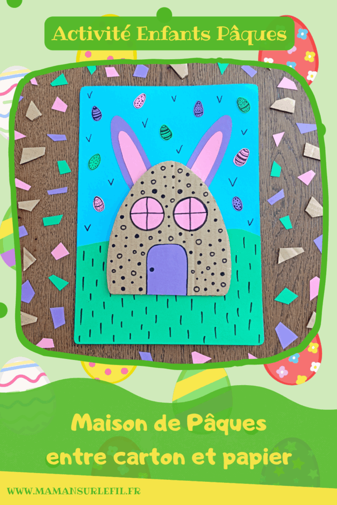 Pâques, c’est enfin demain ! Alors, à cette occasion, je vous propose d’imaginer une maison de Pâques entre carton et papier. Elle a une jolie forme d’oeuf et porte des oreilles de lapin. Et attention aux oeufs qui pleuvent déjà ! C’est une activité rapide entre récup’, découpage, collage et graphismes.