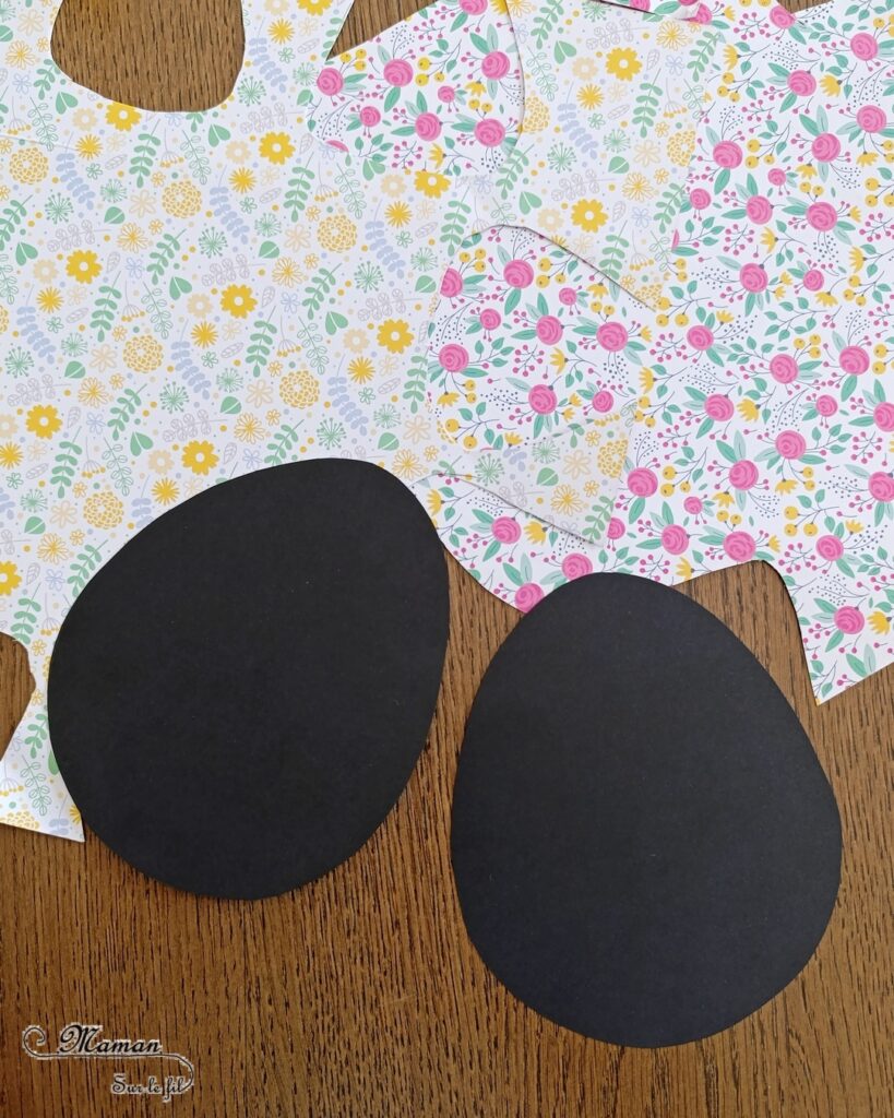 Ensuite, j’ai découpé une forme d’oeuf dans du papier cartonné noir et je l’ai collé sur l’un des papiers fleuris. J’ai découpé une nouvelle fois autour de l’oeuf noir, en laissant une marge d’un centimètre environ, ce qui permet de créer un joli cadre.